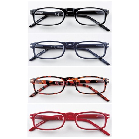 Occhiali da lettura conformi CE. Montatura in policarbonato e aste con molla sistema flex, forniti in sacchetto trasparente. Confezione da 4 pz. Colori assortiti.