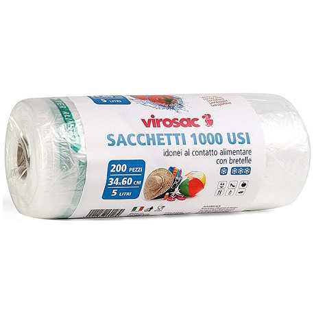 Sacchetti idonei al contatto alimentare con bretelle. Capacita' 5 lt. Dimensioni 34x60 cm. Ideali per: conservare, congelare, proteggere e trasportare. Rotolo da 200 pezzi.
