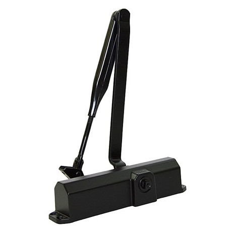 Velocita' e forza di chiusura regolabili, completo di braccio d'arresto a scatto con dispositivo di disinserimento. 3 forze di chiusura: forza 2 per porte da 850 mm, forza 3 per porte da 950 mm e forza 4 per porte fino a 1100 mm. Colore nero