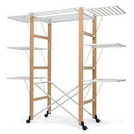 Stendibiancheria pieghevole con struttura in legno massiccio, piano centrale posizionabile al centro o in alto per stendere le lenzuola, ali laterali indipendenti, inclinabili e apribili anche solo in parte. La base e' dotata di 4 ruote. Dimensioni da aperto 80x176x164h cm. Colore naturale.