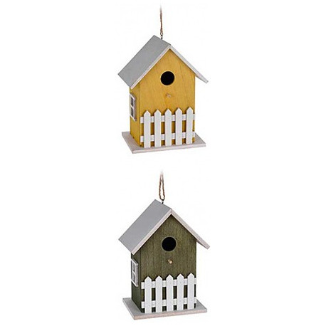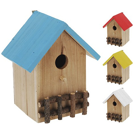Casetta in legno per uccelli modello rustico. Dimensioni 16,5x20x13 cm. Tetto in legno colore naturale, pareti in 3 colori assortiti (rosso / bianco / giallo)