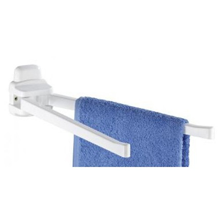 In plastica antiurto. Doppia asta portasciugamani. Dim. 8x43x11 cm. Peso 216 gr. Colore bianco. Incluse viti e tasselli.
