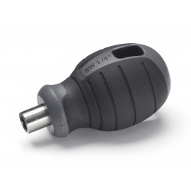 Portainserti con lama corta e impugnatura compatta per un facile accesso in spazi ristretti. Sviluppato per uso professionale insieme agli artigiani. L'impugnatura è realizzata in resistente plastica PPC con un rivestimento in gomma resistente all'invecchiamento e di facile presa. L'impugnatura ha un foro per appenderla o fissarla. Il design dell'impugnatura impedisce al portainserti di rotolare su superfici inclinate.