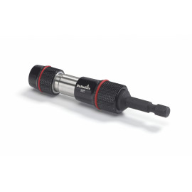 Portainserti magnetico pivot da 1/4 "con funzione di sgancio rapido per uso professionale. Un giunto sferico consente di serrare le viti fino a un angolazione di 20 gradi, anche in aree di difficile accesso. Facendo scorrere il manicotto può essere utilizzato anche come portainserti magnetico standard. La funzione di sgancio rapido facilita l'inserimento della punta e si blocca automaticamente in posizione senza bisogno di spingere indietro la bussola. La guaina nera a rotazione libera consente di stabilizzare la punta durante l'uso.