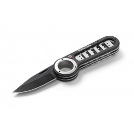 Robusto coltello richiudibile in alluminio rivestito nero, parti in acciaio inossidabile e una lama nera in acciaio inossidabile. Un compagno perfetto da utilizzare in foresta o durante una battuta di pesca. Design compatto con una vasta area di utilizzo. Bloccaggio semplice e sicuro della lama con un pulsante sul lato dell'impugnatura. La clip da cintura è reversibile e può essere montato su entrambi i lati dell’impugnatura. Ciò consente di scegliere come si desidera trasportare il coltello, fissato a una cintura o all'interno di una tasca. Il coltello può essere utilizzato insieme con l’accessorio accendifuoco FS.