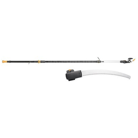 Svettatoio telescopico UPX86 con seghetto. Versione nuova con impugnatura soft-grip, maggiore potenza di taglio e minore manutenzione. Asta telescopica regolabile da 2.4 m a 4 m, per potare fino ad un altezza massima di 6 metri. Angolo di taglio regolabile fino a 230 gradi. Azione bypass delle lame adatta a potare legno fresco fino a 32 mm di diametro. Completo di seghetto con aggancio rapido