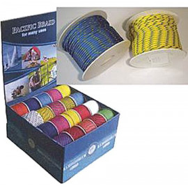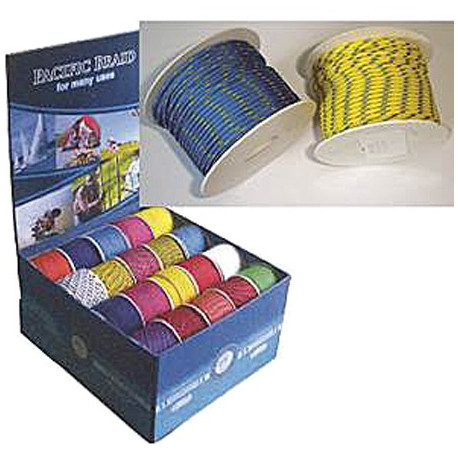 Bobine di treccia in poliestere colorate. Lucida, indeformabile, buona resistenza all'abrasione. Impiego settore nautico. Espositore da banco 40 pezzi (dim. 32,5x28,5x17h cm). Colori assortiti.