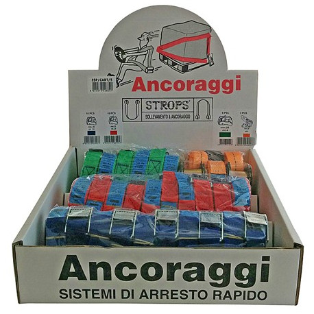 Nastro in poliestere carico di lavoro Kg 2000, con tenditore a cricchetto da mm 50 e ganci. Conf. da 1 pz.