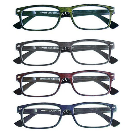 Occhiali per lettura con montatura unisex, in leggero materiale organico iniettato, finitura legno. Aste flessibili con meccanismo a molla. Lenti asferiche sottili e infrangibili, con trattamento antigraffio e antiriflesso. Conformi UNI EN ISO 9001: 2015. Confezione da pz. 4. Colori assortiti.