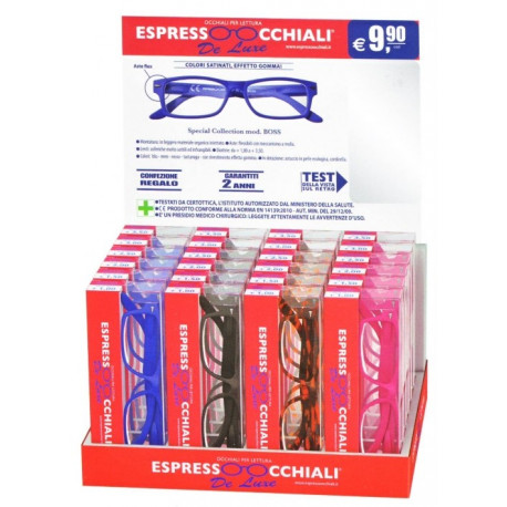 Espositore da banco con 24 occhiali. Completo di specchio, test per autodiagnosi della vista. Assortimento composto da 4 finiture o colori per 6 diottrie (da 1 a 3,5). Dimensioni (lxpxh) cm: 27x21,5x36. Conformi UNI EN ISO 9001:2015.