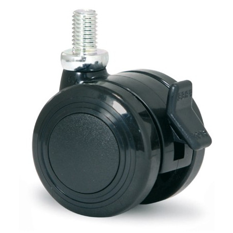 Ruota doppia in poliammide, rivestita in poliuretano con freno. Supporto in poliammide con perno filettato lunghezza 15 mm.